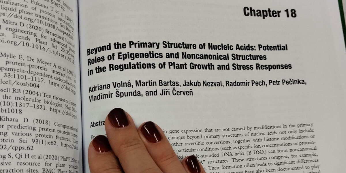 In March this year, the book “Plant Abiotic Stress Signaling” edited by Ivan Couée (University of Rennes, France) was published. The members of Biophysics team (A. Volná, J. Nezval, R. Pech, V. Špunda; Department of Physics) and colleagues from Department of Biology (M. Bartas, P. Pečinka, J. Červeň) contributed to this book by a chapter: “Beyond the Primary Structure of Nucleic Acids: Potential Roles of Epigenetics and Noncanonical Structures in the Regulations of Plant Growth and Stress Responses ”