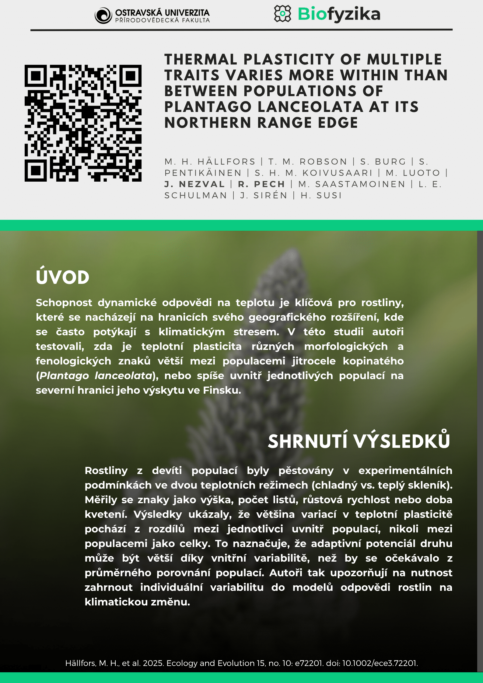 Colleagues Dr. Nezval and Dr. Pech contributed to a publication entitled “Thermal Plasticity of Multiple Traits Varies More Within Than Between Populations of Plantago lanceolata at Its Northern Range Edge”. The publication is a collaboration primarily with colleagues from Finland and was published in the journal Ecology and Evolution.