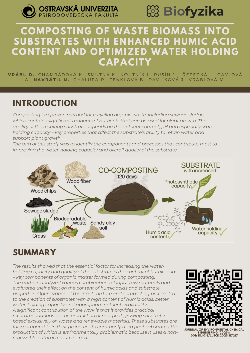 Our members, in collaboration with colleagues from VŠB-TUO and FCC, have published a new article in the Journal of Environmental Chemical Engineering. The study is titled “Composting of waste biomass into substrates with enhanced humic acid content and optimized water holding capacity”.