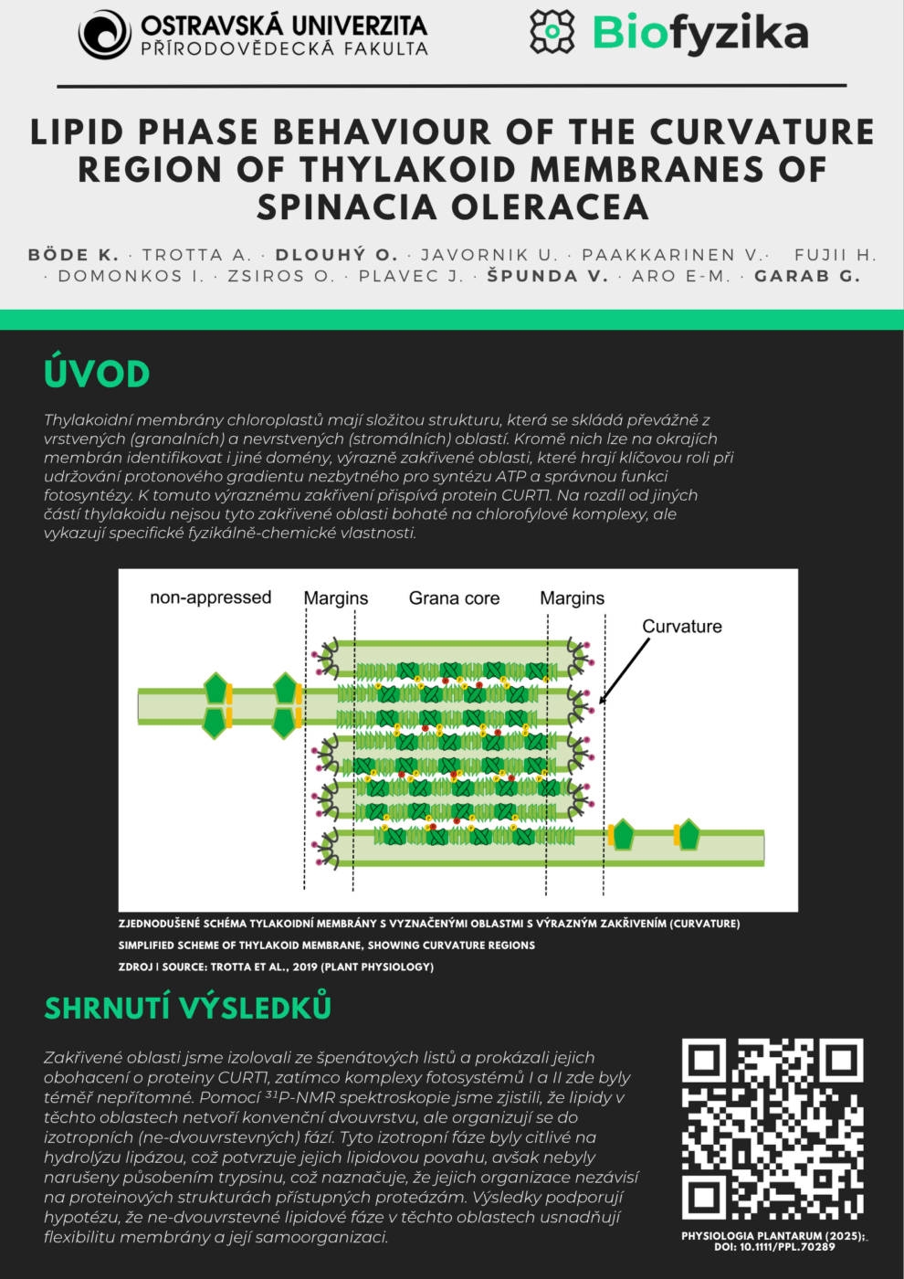 Členové týmu věnujícímu se výzkumu „Role nedvouvrstevných lipidových fází ve struktuře a funkci thylakoidních membrán“ publikovali nový článek v odborném časopise Physiologia Plantarum. Studie nese název „Lipid phase behaviour of the curvature region of thylakoid membranes of Spinacia oleracea“.